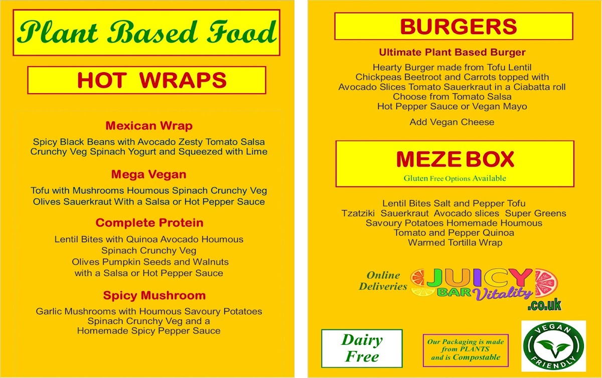 Juicybar Vitality’s menu offers a vibrant selection of dishes that cater to a variety of tastes, with an emphasis on fresh, wholesome ingredients. The Chia Desert stands out as a light yet indulgent option, perfect for those with a sweet tooth seeking a nutritious treat. For a heartier meal, the Ultimate Burger delivers a satisfying combination of flavors and textures, with a generous patty that satisfies even the biggest appetites. Those following a plant-based diet will appreciate the Mega Vegan Wrap, packed with fresh veggies and vegan-friendly ingredients that don’t compromise on taste. To complement any meal, the Juice Pack provides a refreshing burst of nutrients, with an array of freshly pressed juices that perfectly align with the restaurant’s commitment to vitality and wellness. Whether you’re in the mood for a light bite or a more filling option, Juicybar Vitality offers a menu that’s both nourishing and flavorful, making it a top choice for anyone looking to fuel their body with healthy, delicious food.